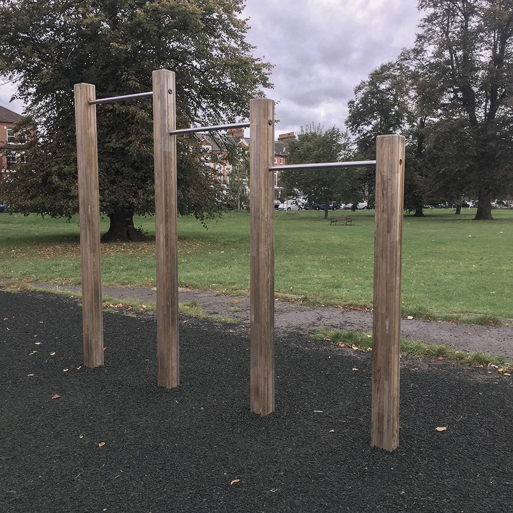 The highest bar is high enough to dead hang without my feet touching the floor (I am only 5’7, but the bar is quite high). They’re quite short so you can’t do wide grip pull ups without your elbows hitting the posts.