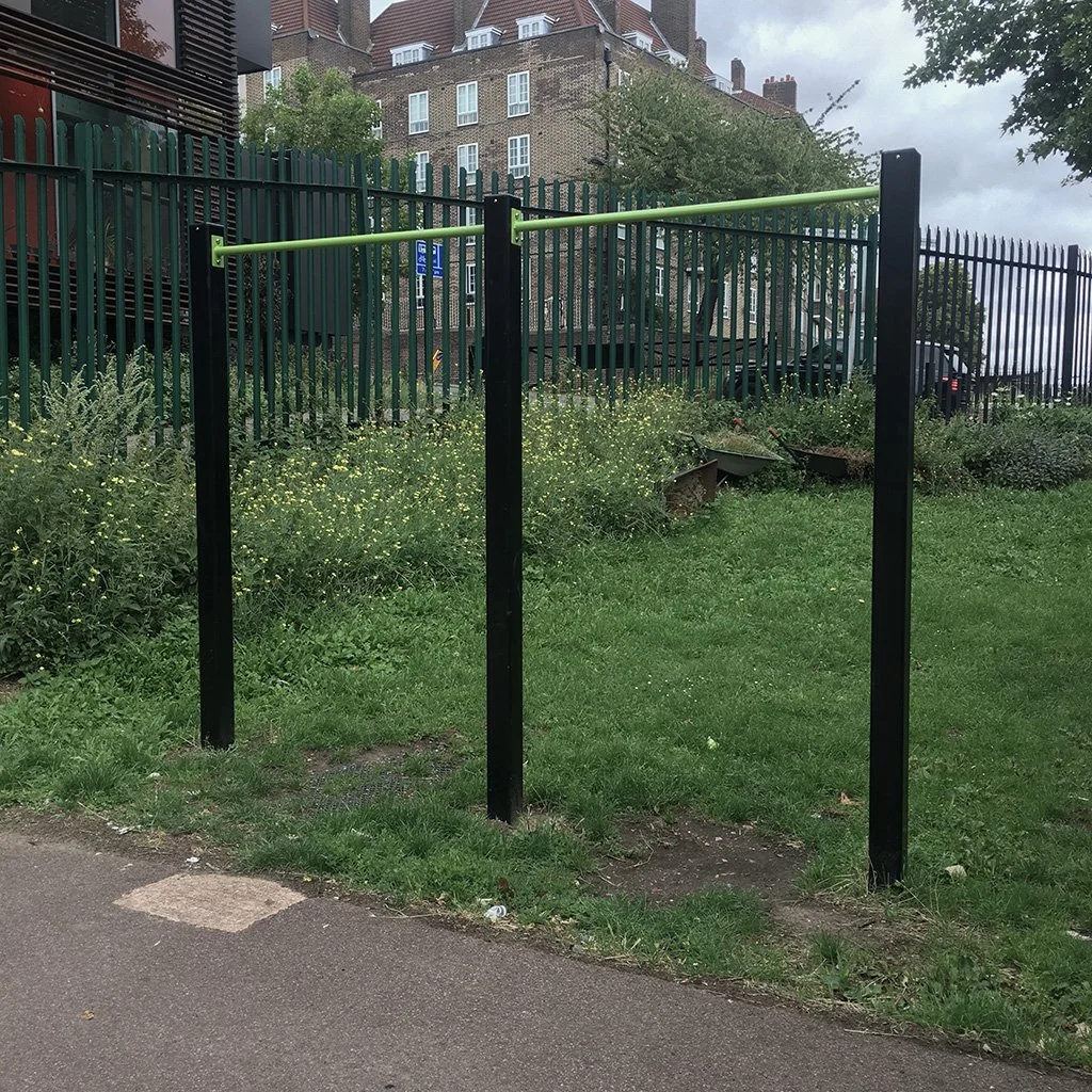 Both bars are the same height and they’re a bit on the low side. They’re on the edge of a kids park, which makes it hard to workout with being interrupted.